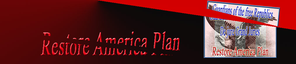 The Restore America Plan is a bold achievable strategy for behind-the-scenes peaceful reconstruction of the De Jure institutions of government without controversy, violence or civil war. After consultation with high ranking members of the United States armed forces, the Plan is in the process of assembling the Guardians of the Free Republics and re-inhabiting the De Jure Grand Juries.